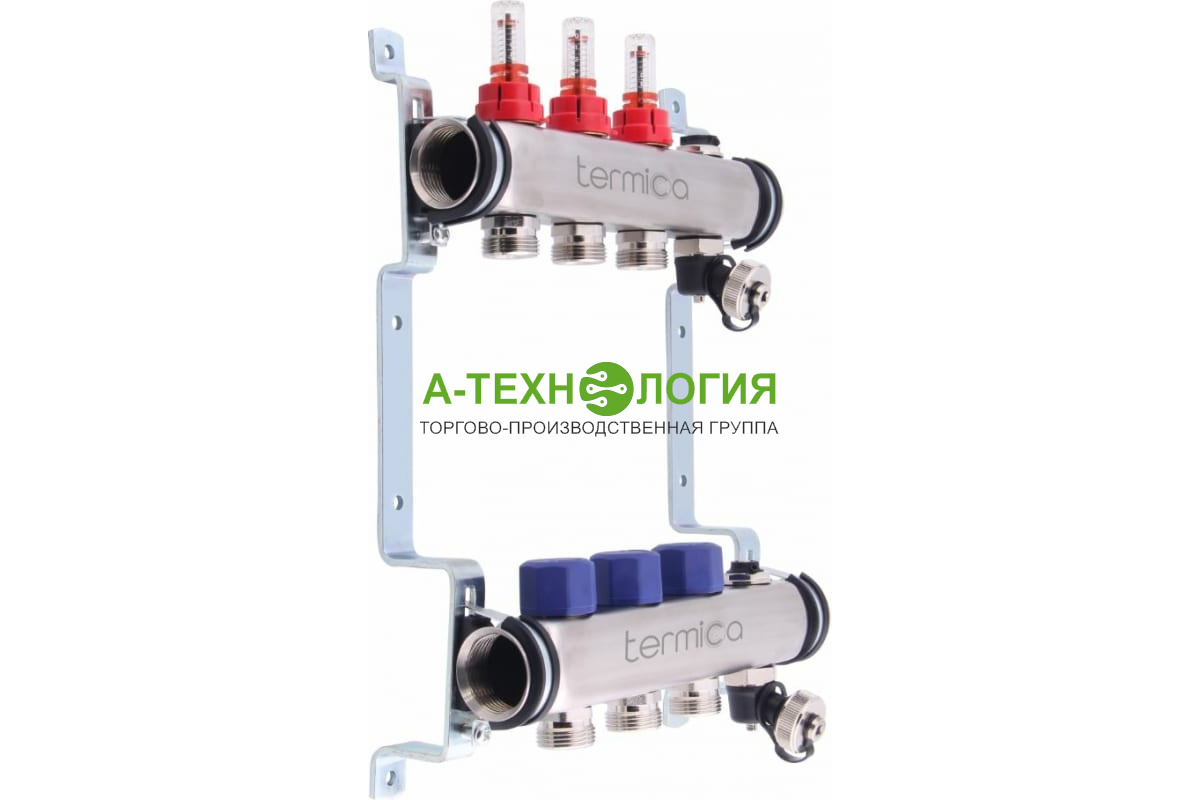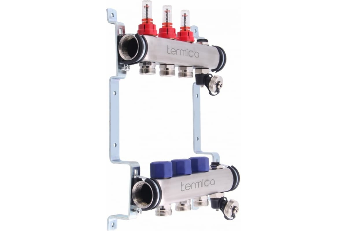 Коллекторный блок объединяет в себе подающий и обратный коллекторы, ручные настроечные клапаны с расходомерами, кронштейнами для монтажа на стене.