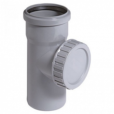 Конструкция: вставка-тройник с резьбовой заглушкой на боковом патрубке, которая устанавливается в линейную часть канализационной трубы. Диаметр ревизионного отверстия немного меньше проходного диаметра ревизии, а заглушка комплектуется уплотнительным кольцом.